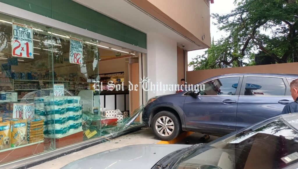 Una camioneta Honda CRV color azul marino impactó contra el cristal de una de las Farmacias Guadalajara ubicada sobre la avenida Lázaro Cárdenas, cerca de Ciudad Universitaria, en Chilpancingo.