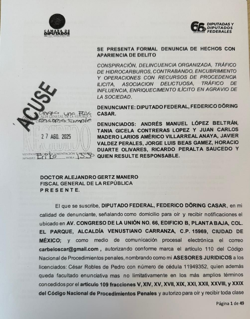 MÉXICO. —El 27 de agosto de 2025, Federico Döring presentó una denuncia formal ante la Fiscalía General de la República contra Andrés Manuel López Beltrán, Tania Gisela Contreras López, Juan Carlos Madero Larios, Américo Villarreal Anaya, Javier Valdez Perales, Jorge Luis Beas Gámez, Horacio Duarte Olivares, Ricardo Peralta Saucedo y quien resulte responsable.