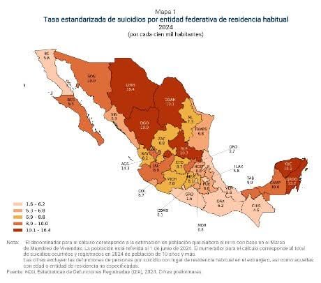 Al analizar los datos por entidad, resultó que las tasas de suicidio estandarizadas más elevadas se registraron en Chihuahua (16.4), Yucatán (16.2) y Aguascalientes (14.3), todas por encima de la tasa nacional.