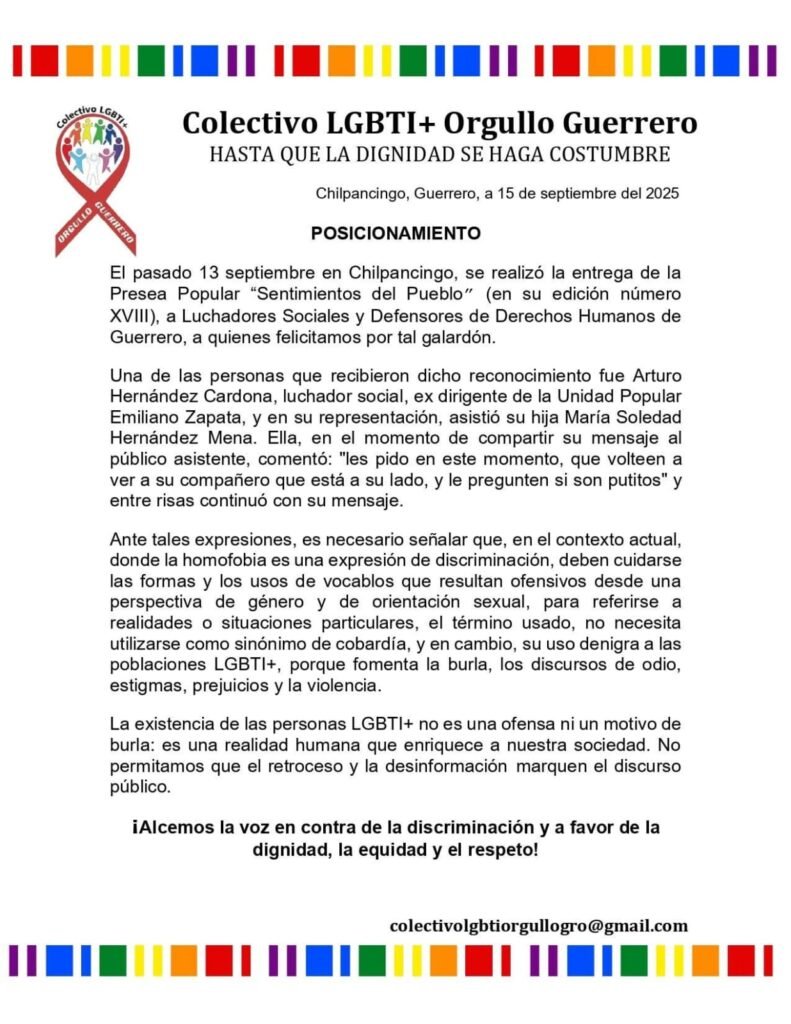 El Colectivo LGBTI+ “Orgullo Guerrero” se pronunció en contra de las expresiones vertidas por María Soledad Hernández Mena, hija del luchador social Arturo Hernández Cardona, durante la entrega de la Presea Popular “Sentimientos del Pueblo”, realizada el pasado 13 de septiembre en Chilpancingo.