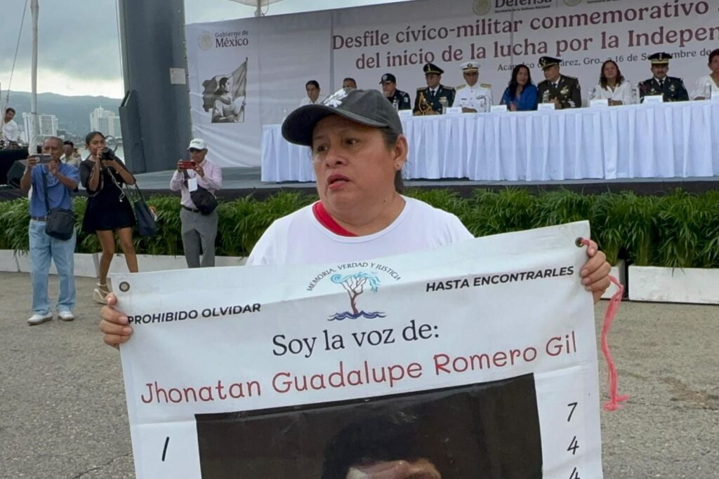 ACAPULCO. —Al concluir el desfile cívico-militar realizado este 16 de septiembre, integrantes del colectivo Memoria, Verdad y Justicia Acapulco se manifestaron para visibilizar la ausencia de sus seres queridos y exigir a las autoridades que cumplan con su labor de búsqueda.