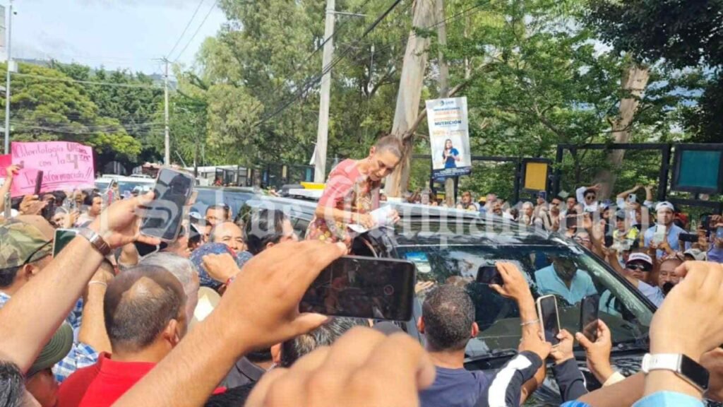 Alrededor de las 2:40 de la tarde, arribo Sheinbaum Pardo, quien salió unos minutos del vehículo en el que se trasladaba, recibió el documento del magisterio disidente y lo firmó.