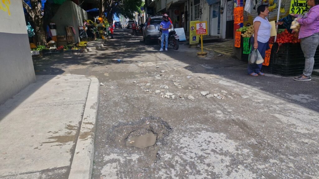 Comerciantes denunciaron que la situación empeora durante las precipitaciones, ya que el agua se acumula en los baches y, al pasar los automóviles, salpica su mercancía y a los transeúntes.