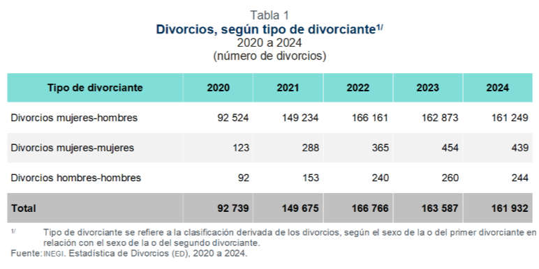 Se registraron 161 249 divorcios entre parejas constituidas por una mujer y un hombre; 439 entre las constituidas solo por mujeres y 244 entre las formadas solo por hombres. De 2020 a 2024, los casos con divorciantes del mismo sexo se incrementaron y los divorcios entre mujeres han sido superiores a los divorcios entre hombres.