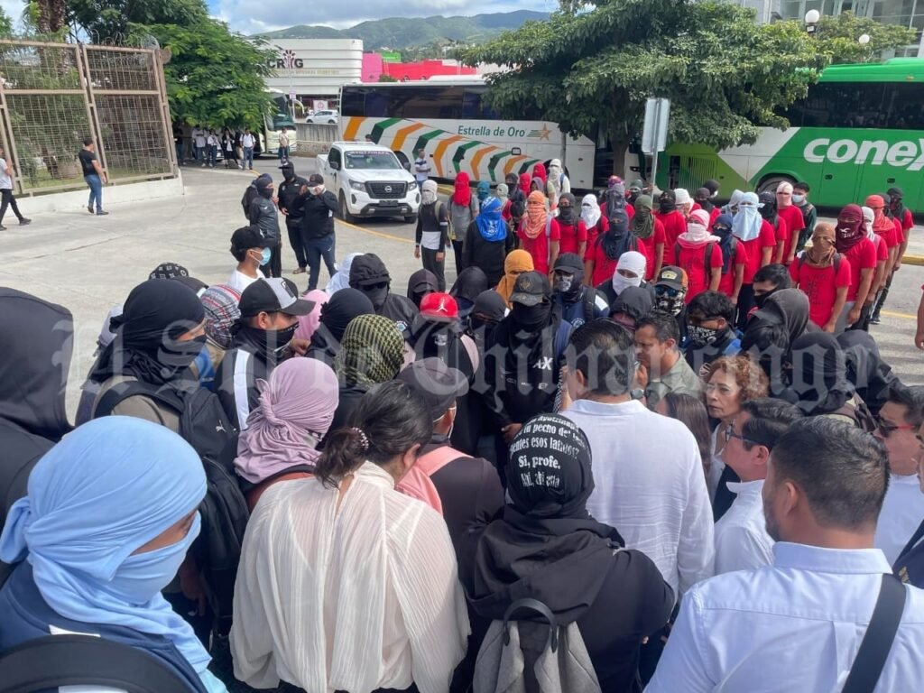 Aproximadamente un centenar de jóvenes se concentraron en el acceso principal del inmueble, mientras en el interior se desarrollaba el homenaje cívico semanal encabezado por la gobernadora Evelyn Salgado Pineda.