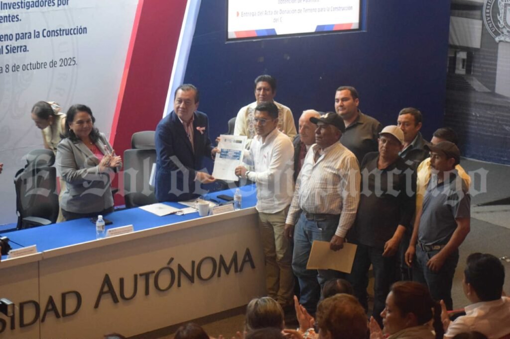 El comisario de la comunidad de Yextla, Luis Miguel Arellano Flores, acompañado de ejidatarios de la región, entregaron al rector de la Universidad Autónoma de Guerrero (UAGro), Javier Saldaña Almazán, el acta de donación del terreno que será destinado para la construcción del Campus Regional de la Sierra.
