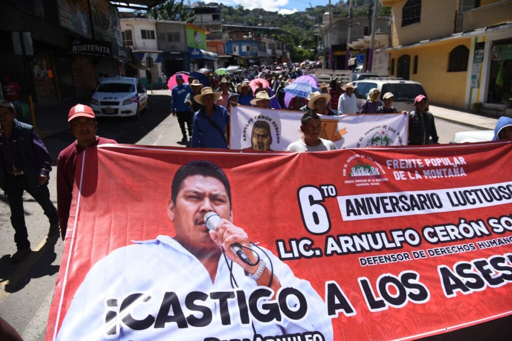 Unos 500 afiliados al Frente Popular de la Montaña (FPM) realizaron una marcha este sábado para exigir que se haga justicia por el asesinato de su dirigente Arnulfo Cerón Soriano quien fue desaparecido el 11 de octubre del 2019 y fue encontrado sin vida enterrado en una fosa clandestina unas semanas después en la periferia de Tlapa.