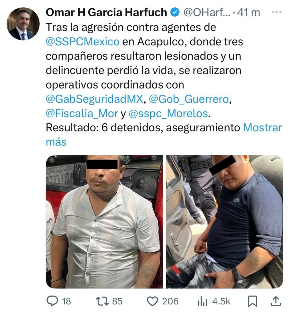 El secretario de Seguridad y Protección Ciudadana de México, Omar García Harfuch, confirmó la detención de seis personas luego de un ataque armado registrado contra agentes federales en la calle de El Taller de la colonia El Roble, en el puerto de Acapulco.