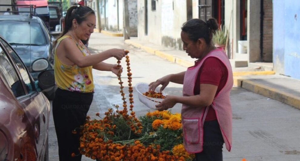 Cada año, habitantes como Celia Isidro Baltazar y Alberto Mariano Flores recorren los cerros y campos para recolectar flores de cempasúchil, conzattii y oquiztle, que nacen de manera natural según el temporal de lluvias. Las acomodan en manojos y las venden a 10 pesos en carretillas o directamente afuera de sus viviendas.