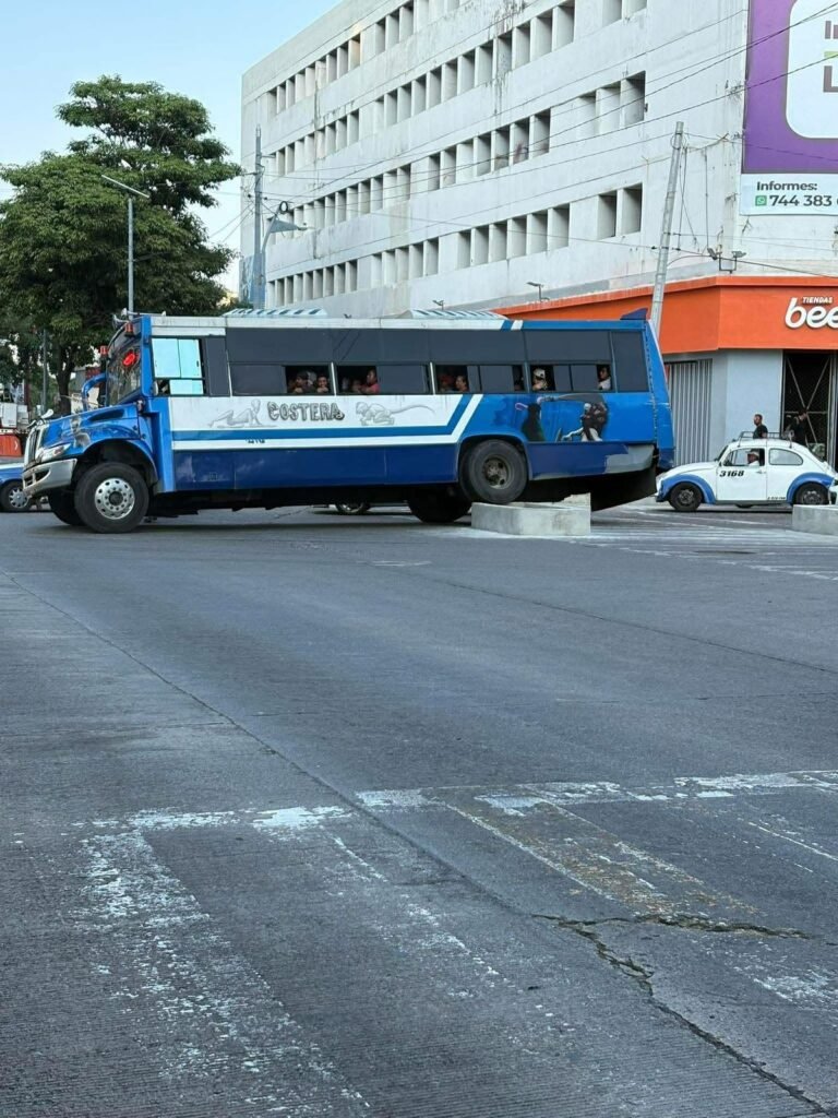 ACAPULCO. — Un camión urbano terminó montado sobre la banqueta recién remodelada por personal de Fonatur en la avenida Costera Miguel Alemán, a la altura de la Gran Plaza, luego de que el chofer perdiera el control cuando maniobraba de reversa la mañana de este miércoles.