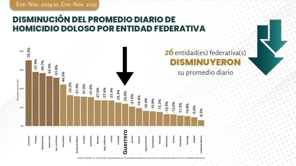 Guerrero se ubicó en ese comparativo en el lugar número 15 de las entidades en donde hubo disminución de homicidios dolosos en ese comparativo y según esas cifras se han registrado 24 por ciento menos homicidios en estos 11 meses del año, comparados con el 2024.