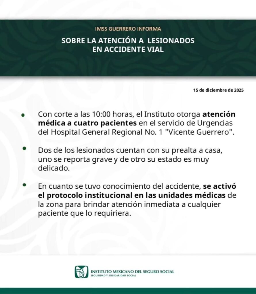 El IMSS señaló además que al tener conocimiento del accidente, se activó de inmediato el protocolo institucional con las unidades médicas de la zona para dar atención oportuna a los afectados y donde hasta el momento, no se ha dado a conocer la identidad de los pacientes.