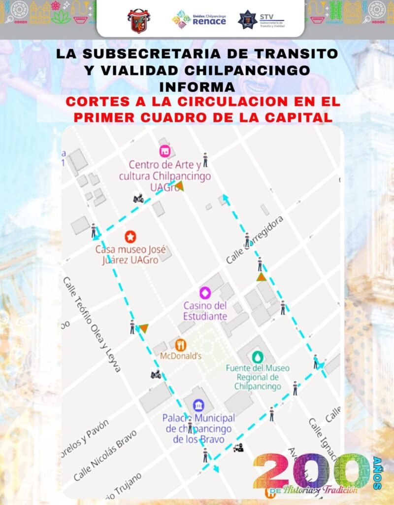 Con motivo de los festejos de la Feria de Chilpancingo, San Mateo, Navidad y Año Nuevo, específicamente por la instalación del Teatro del Pueblo, la Subsecretaría de Tránsito y Vialidad Municipal anunció el cierre de la circulación vehicular en algunas calles del primer cuadro de la ciudad.