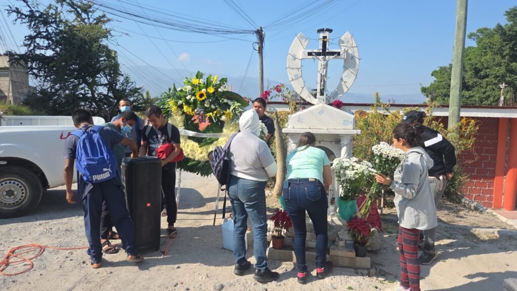 Antes de iniciar el mitin político, los estudiantes y la madre del normalista colocaron una ofrenda floral en el mausoleo edificado en el punto donde Yanki fue asesinado.