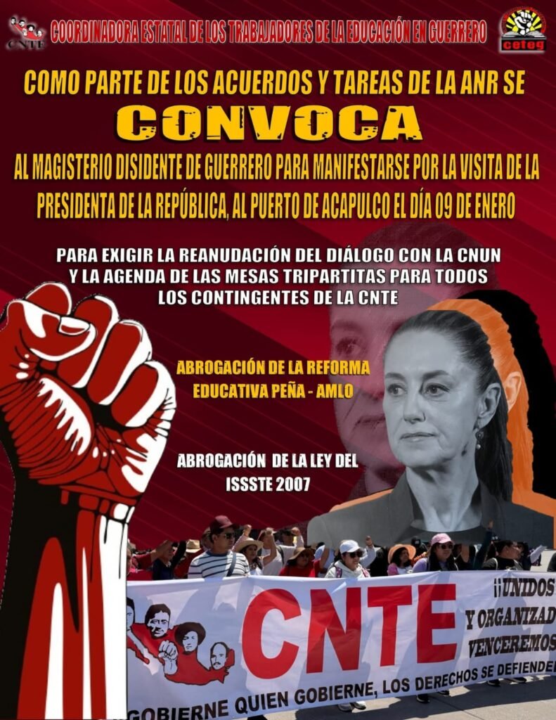 “Al magisterio disidente de Guerrero se le convoca a una manifestación por la visita de la Presidenta de la República al puerto de Acapulco, el día 09 de enero de 2026”, señala el documento difundido por la CETEG.