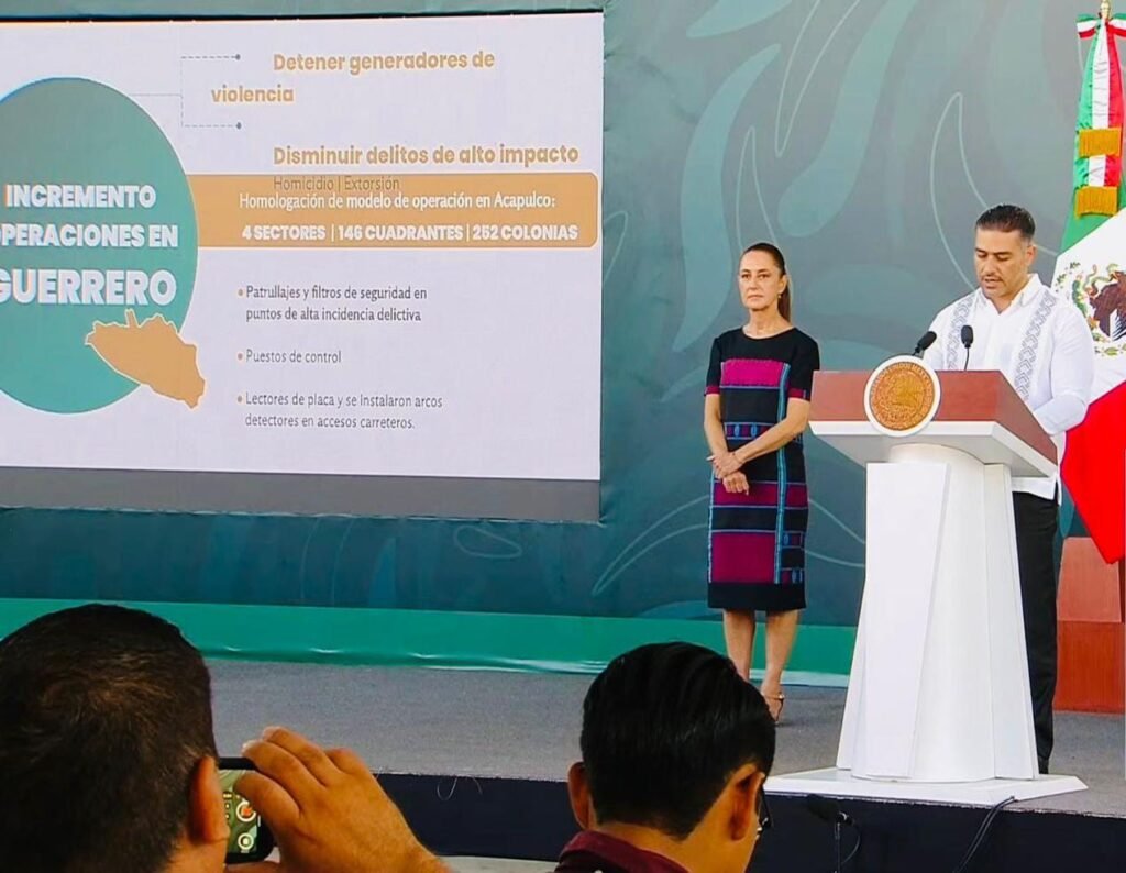 Señaló que desde el inicio de la administración y por instrucciones de la presidenta “se han incrementado las operaciones en Guerrero, con el objetivo de detener a generadores de violencia y disminuir los delitos de alto impacto como el homicidio y la extorsión, en este período se homologó el modelo de operación en 4 sectores en Acapulco, 146 cuadrantes y 252 colonias donde se realizan patrullajes y filtros de seguridad en puntos de alta incidencia delictiva, se han establecido puestos de control itinerantes, se incorporaron lectores de placas y algunos arcos detectores en accesos carreteros”.
