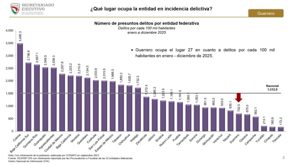 Guerrero logró ubicarse entre las entidades con menor incidencia delictiva a nivel nacional durante 2025, al colocarse por debajo de la media nacional en delitos por cada 100 mil habitantes, de acuerdo con cifras oficiales del Secretariado Ejecutivo del Sistema Nacional de Seguridad Pública (SESNSP).