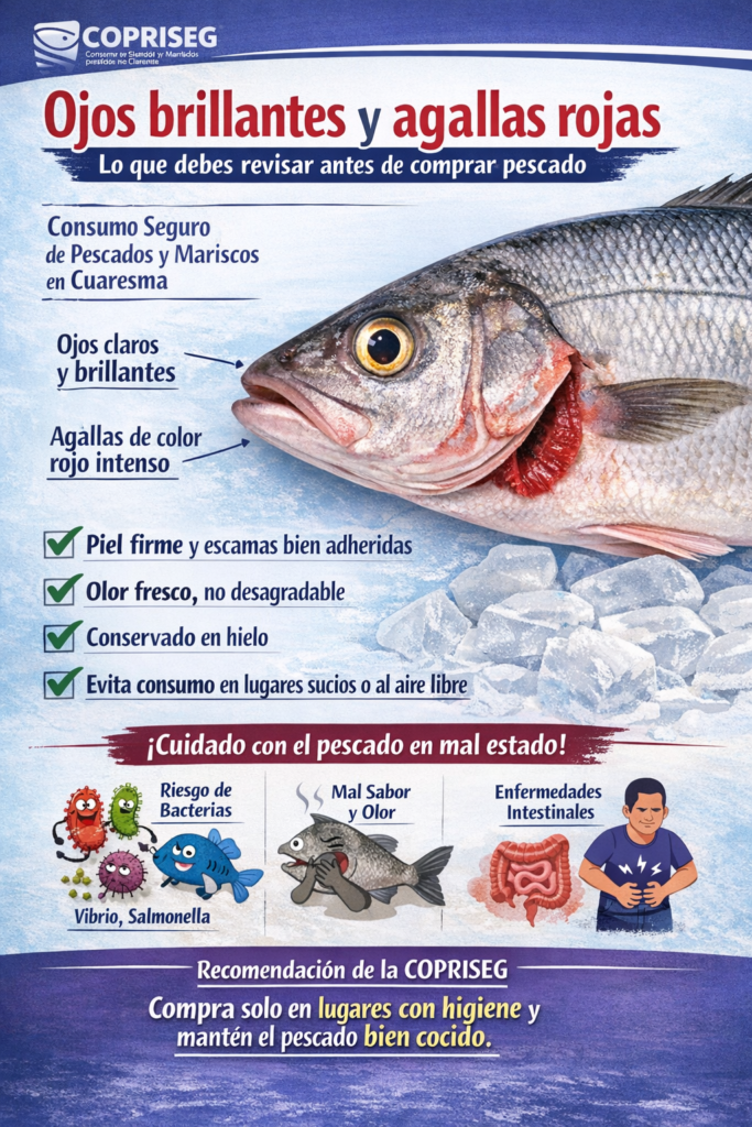 Para asegurar un consumo seguro, la COPRISEG recomienda a la población verificar que el producto sea fresco y someterlo a procesos de cocción que alcancen el punto de ebullición, superando los 70 grados Celsius. Al momento de la compra, es fundamental observar que los pescados tengan ojos brillantes, saltones y transparentes, agallas de color rojo vivo, piel firme y escamas bien adheridas. Se debe evitar estrictamente adquirir productos que estén expuestos al polvo, insectos o que se comercialicen en la vía pública sin las condiciones de higiene necesarias, como es el caso de ceviches o cócteles crudos vendidos en la calle.